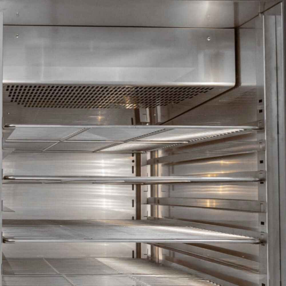 Késletetett kelesztőszekrény teljes egészében rozsdamentes acélból, belül lekerekített sarkokkal és formázott aljjal, 60 mm-es környezetbarát poliuretán szigeteléssel, érintőképernyővel.