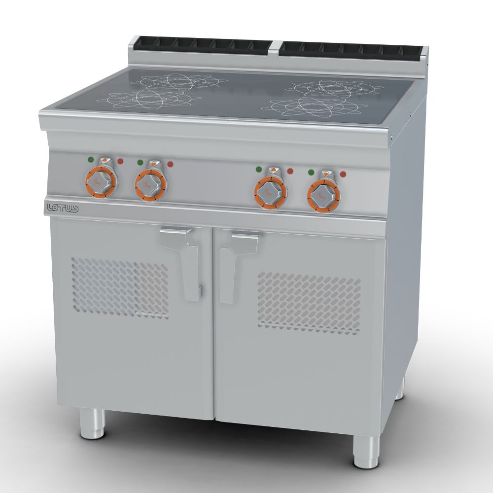 Olaszországban gyártott, rozsdamentes acél kivitelű, elektromos ipari indukciós tűzhely, főzőlap, 4 zónával, 2 mm vastag munkalappal, alsó tárolóval, IPX5 védelemmel. A főzőfelületek üvegkerámiából készültek, a vezérlés tekerőgombbal történik.
